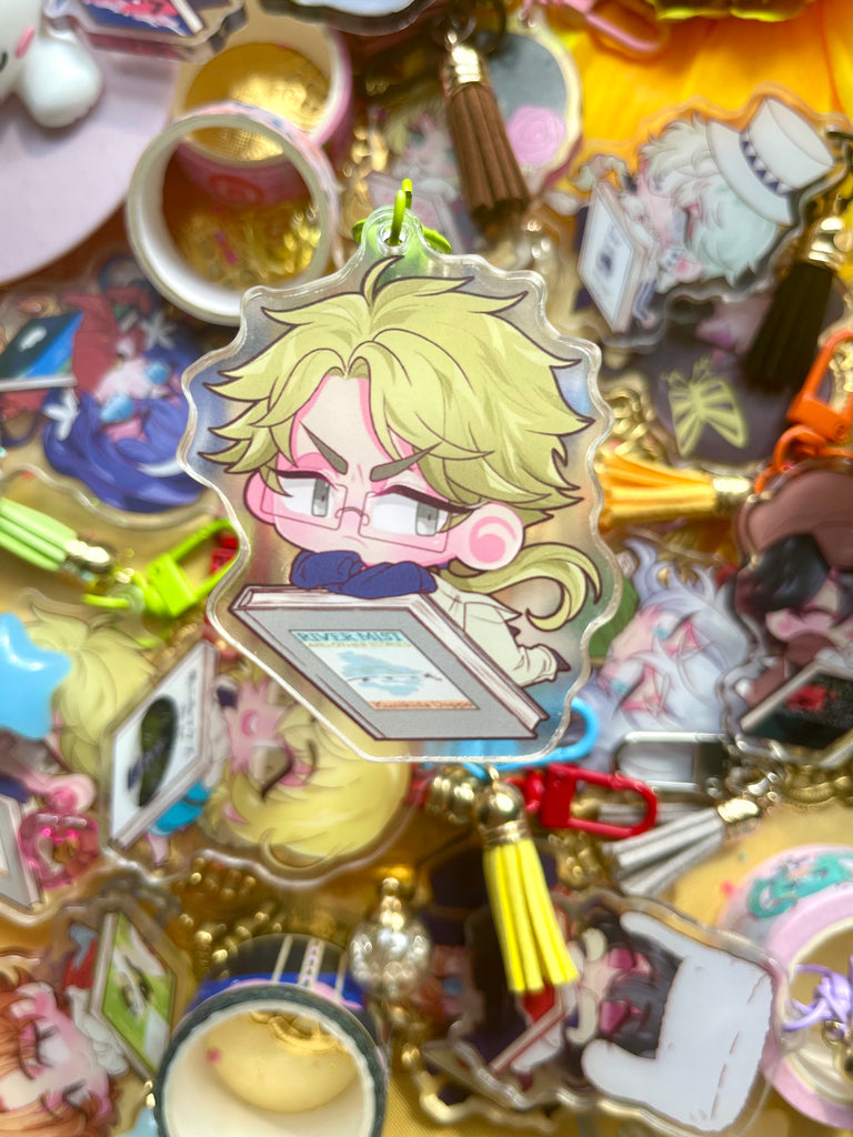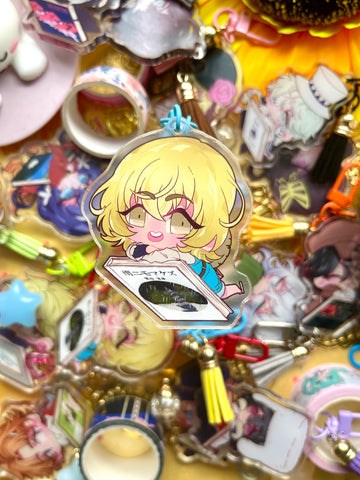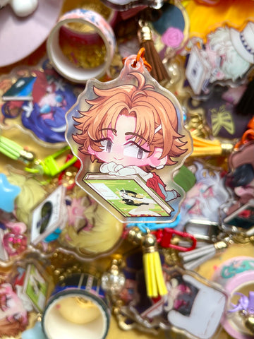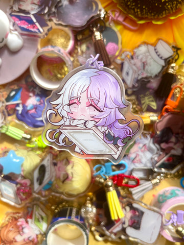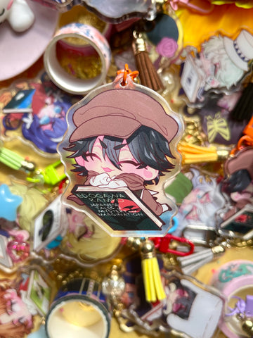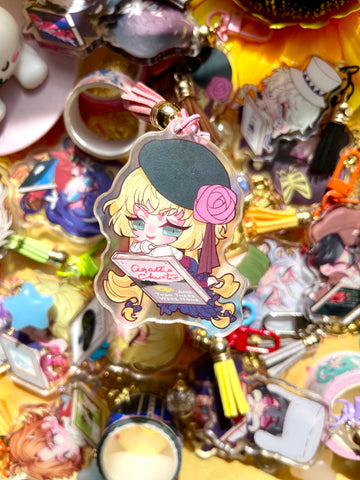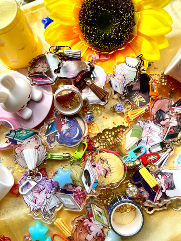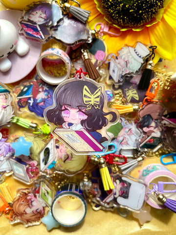 2.5 inches. acrylic. attached with a colour coordinated lobster clasp & tassel.