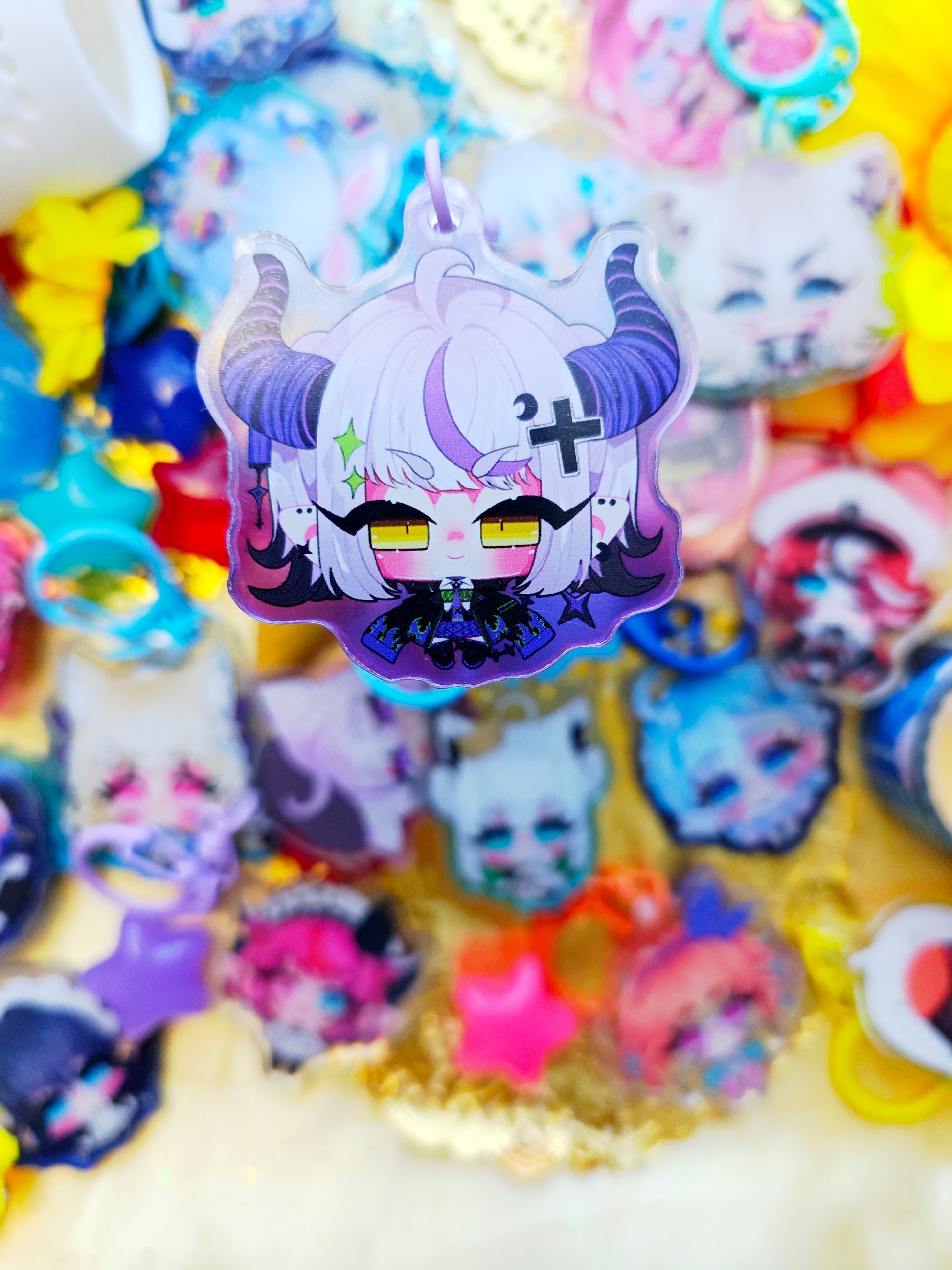 1.8 inches. acrylic. attached with a coloured lobster clasp.
